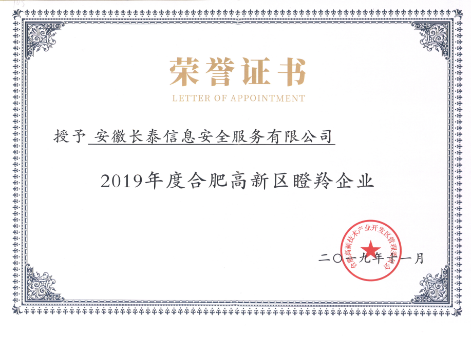 2019年,11月20日,合肥高新区2019年高成长企业榜单正式发布,高新区共认定了502家高成长企业,其中雏鹰企业275家、瞪羚培育企业72家、瞪羚企业149家、潜在独角兽企业3家、独角兽企业1家、平台型龙头企业2家。作为其中的高科技企业——安徽开云·官方在线登陆入口-开云(中国)成功入选瞪羚企业榜单。